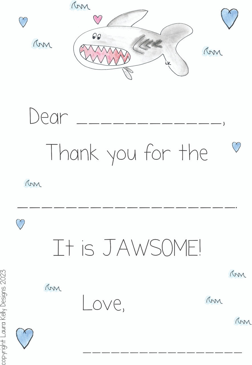 Adorable fill-in thank you notes come in packages of 8, each design with its own colorful envelope. Each note measures 5.7 inches.