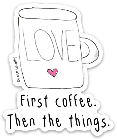 Everyone Matters Collection. First coffee. Then the things. #vinylsticker #LauraKellyDesigns #Kindness #coffee